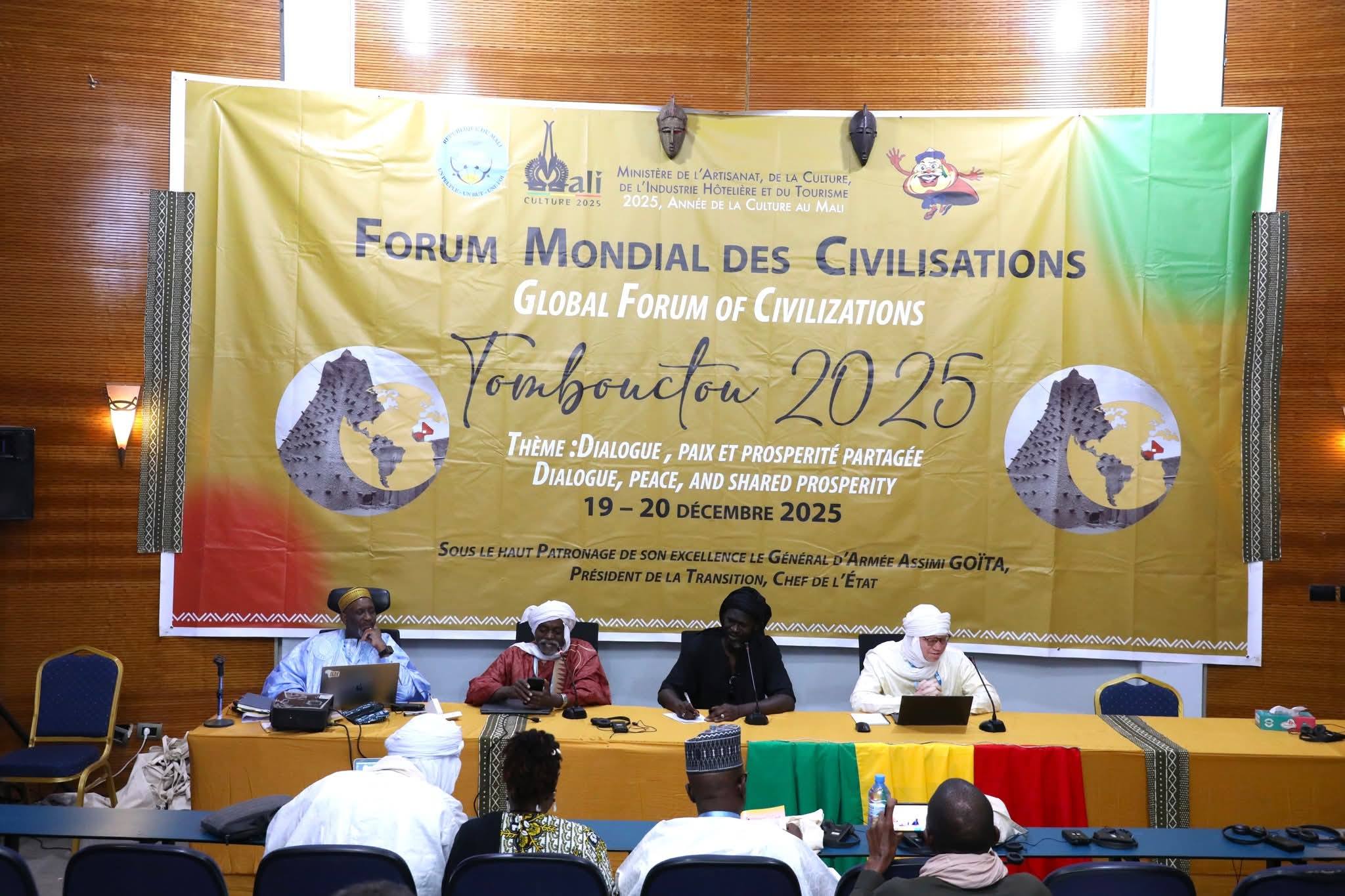 En marge des compétitions de la biennale, la ville a également accueilli un forum mondial des civilisations les 19 et 20 décembre 2025 sur le thème : dialogue, paix et prospérité partagée. le Pr. Ibrahima WANE a prononcé la conférence introductive, suivie du premier panel animé par le Pr. Ibrahim Iba N’DIAYE et le Pr. Yacouba KONATE, sous la modération du Dr Mamadou Dia. Ce panel, consacré au thème « Dialogue interculturel, facteur de paix et de prospérité », a marqué le début des échanges intellectuels et culturels du Forum. Dr Banzoumana Traoré de l’UNESCO, en compagnie du chercheur indépendant Sane Chirfi Alpha ont développé le thème : développement de l’économie de la culture autour des ressources patrimoniales : cas des sites, monuments et manuscrits anciens de Tombouctou. Ils ont traité de la valorisation des manuscrits anciens du Mali, le rôle magistral que l'État doit jouer afin d'assurer une souveraineté quant à la gestion de ces manuscrits anciens pour en faire un levier de prospérité scientifique et économique pour le Mali.